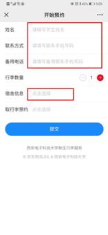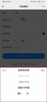 3.进入开始预约界面,依次填写“姓名、联系方式、备用电话”等个人信息,然后点击“宿舍信息”;