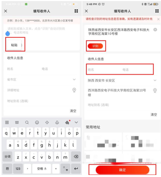 10.长按上方文件框,将复制好的地址粘贴至框内,点击“识别”,然后依次填写“收件人姓名、电话”,确认无误点击“确定”后,返回寄件页面;