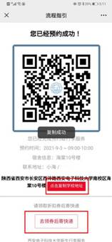 7.看到预约成功的提示后,点击“复制学校地址”,显示“复制成功”(如未复制成功可手动选取内容复制),然后点击下方“去领券后寄快递”;