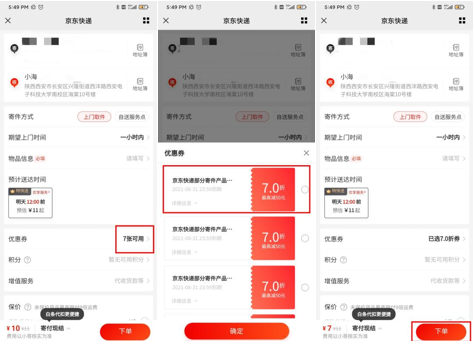 11.点击优惠券一栏“X张可用”,选取7折优惠券并点击“确定”,返回寄件页面后,核对信息无误,点击“下单”即可。