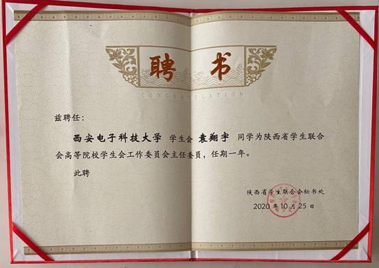 自全国学联二十七大召开以来,各级学联学生会组织对标改革文件、制定改革方案,陕西省学生联合会响应号召,召开联席会议,成立陕西省学生联合会高等院校学生会、高等院校与科研教育机构研究生会、中学中职学生会工作委员会,经前期招募、面试选拔、对外公示后,我校2017级本科生袁翔宇当选陕西省学生联合会高等院校学生会工作委员会主任委员,此举加强了我校学生会组织与陕西省高等院校学生会组织之间的交流,以此深化改革,提升我校学生会组织先进性。