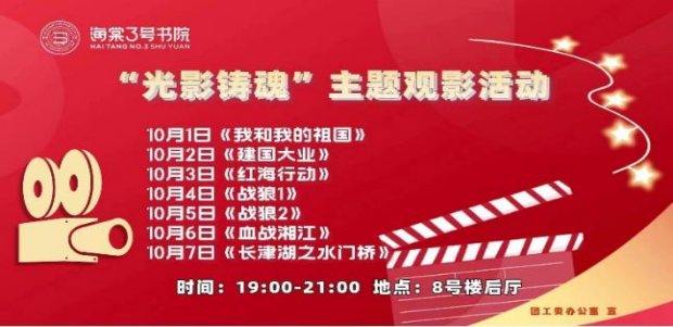 (通讯员 窦金娣)10月1日至7日,为庆祝中华人民共和国成立73周年,海棠3号书院举办“光影铸魂”国庆主题观影活动,连续7天每晚在海棠8号楼后厅播放红色电影。此次活动由书院团工委办公室主办,参加观影的同学在享受了一场场视觉盛宴的同时,通过电影荧幕了解生动真实的历史事件,感受革命英雄坚如磐石的理想信念。