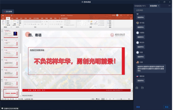 在问题答疑环节,针对前期收集到的同学们关心的问题做了详实的解答,如“对于学习不在状态的情况,该怎样调节”、“考试范围及期中考试影响”等等。在解答完新生目前学习生活中面临的问题与困扰后,白镇华还为学弟学妹们送上了“不负花样年华,勇创光明前景”的祝福。