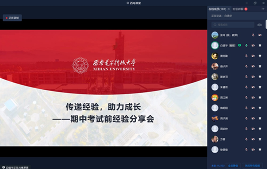 分享过程分为四个部分:经验总述、各科目的不同应对方式、问题答疑和寄语。白镇华作为学长结合自己的亲身经历,为第一次面对大学期中考试的同学们提供了切实有效的备考策略、复习指导。除了提醒同学们重视考前课程,进行有计划的复习外,白镇华还特别叮嘱大家要重视练习往年真题,提升应考能力。