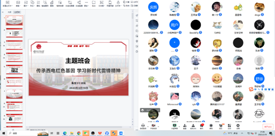(通讯员张楠)为了响应国家“让雷锋精神在新时代绽放更璀璨光芒”的重要指示,海棠3号书院223134-223138电子信息类行政班于3月19日晚八点线上开展。本次活动由辅导员罗庆辉主持。