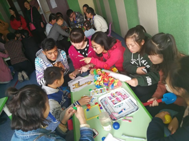 两点十分,在家长和医护人员的陪伴下,小朋友们来到了活动现场。学员们陪着孩子们一起搭积木,一起唱儿歌,和他们玩手偶,教他们画画、折纸。身体的缺陷没有改变小朋友们的单纯和对美好生活的热爱,欢乐的笑容一直在他们脸上溢,快乐的气氛感染着在场的每一个人。随后,学员们为孩子送上棉袄、方巾、套袖和自制的小灯做礼物。当学员们要离开时,每一位小朋友都依依不舍。